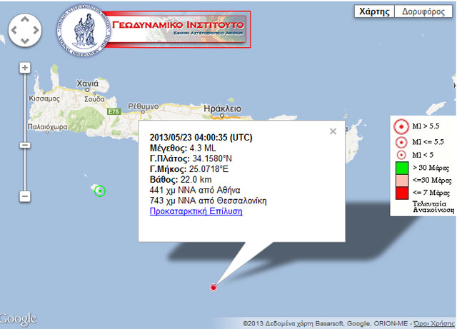 Ασθενής σεισμική δόνηση 4,3 βαθμών της κλίμακας Ρίχτερ σημειώθηκε στις 07.00 το πρωί σε θαλάσσια περιοχή νότια της Κρήτης.