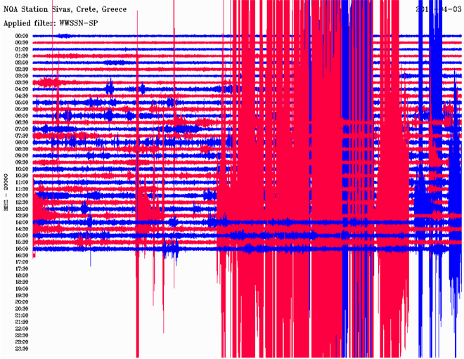 Δείτε τις σεισμικές δονήσεις που κατέγραψαν οι σεισμογράφοι του Γεωδυναμικού Ινστιτούτου του Εθνικού Αστεροσκοπείου Αθηνών στην περιοχή νότια της Κρήτης.