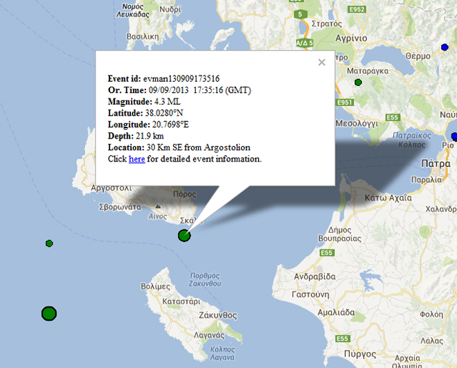 Νωρίτερα το μεσημέρι σημειώθηκε ακόμα μια σεισμική δόνηση με το ίδιο μέγεθος στον θάλασσιο χώρο 44 χιλιόμετρα νότια, νοτιοδυτικά του Αργοστολίου.