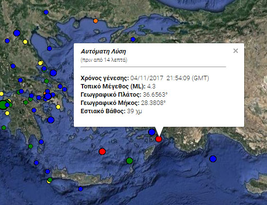 Σεισμική δόνηση μεγέθους 4,3 βαθμών της κλίμακας Ρίχτερ σημειώθηκε στις 23.54 το Σάββατο σε θαλάσσιο χώρο βόρεια της Ρόδου, σύμφωνα με εκτίμηση του Γεωδυναμικού Ινστιτούτου του Εθνικού Αστεροσκοπείου Αθηνών.