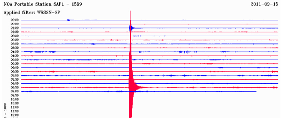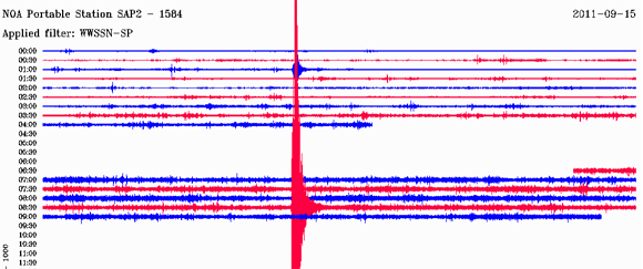 Δείτε πώς κατέγραψε τη δόνηση ο πρώτος εκ των τεσσάρων ψηφιακών φορητών σεισμογράφων του Γεωδυναμικού Ινστιτούτου του Εθνικού Αστεροσκοπείου Αθηνών που βρίσκεται στο Ακρωτήρι Σαντορίνης και εγκατέστησε πρόσφατα ο Μάκης Χουλιάρας για την βελτίωση της παρακολούθησης της σεισμικότητας.