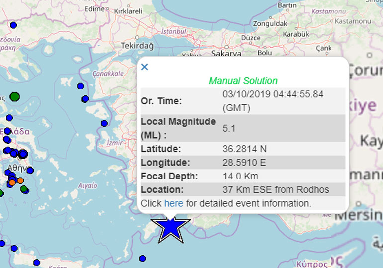 Το επίκεντρο του σεισμού εντοπίζεται στα 37 χιλιόμετρα ανατολικά νοτιοανατολικά της Ρόδου και το εστιακό του βάθος υπολογίζεται στα 14 χλμ.