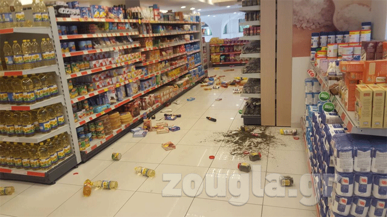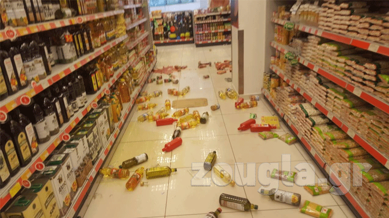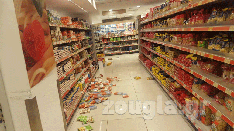 Από τον σεισμό τρόφιμα έπεσαν από τα ράφια των σούπερ μάρκετ. Ενώ καταγράφηκαν ρωγμές στους τοίχους.