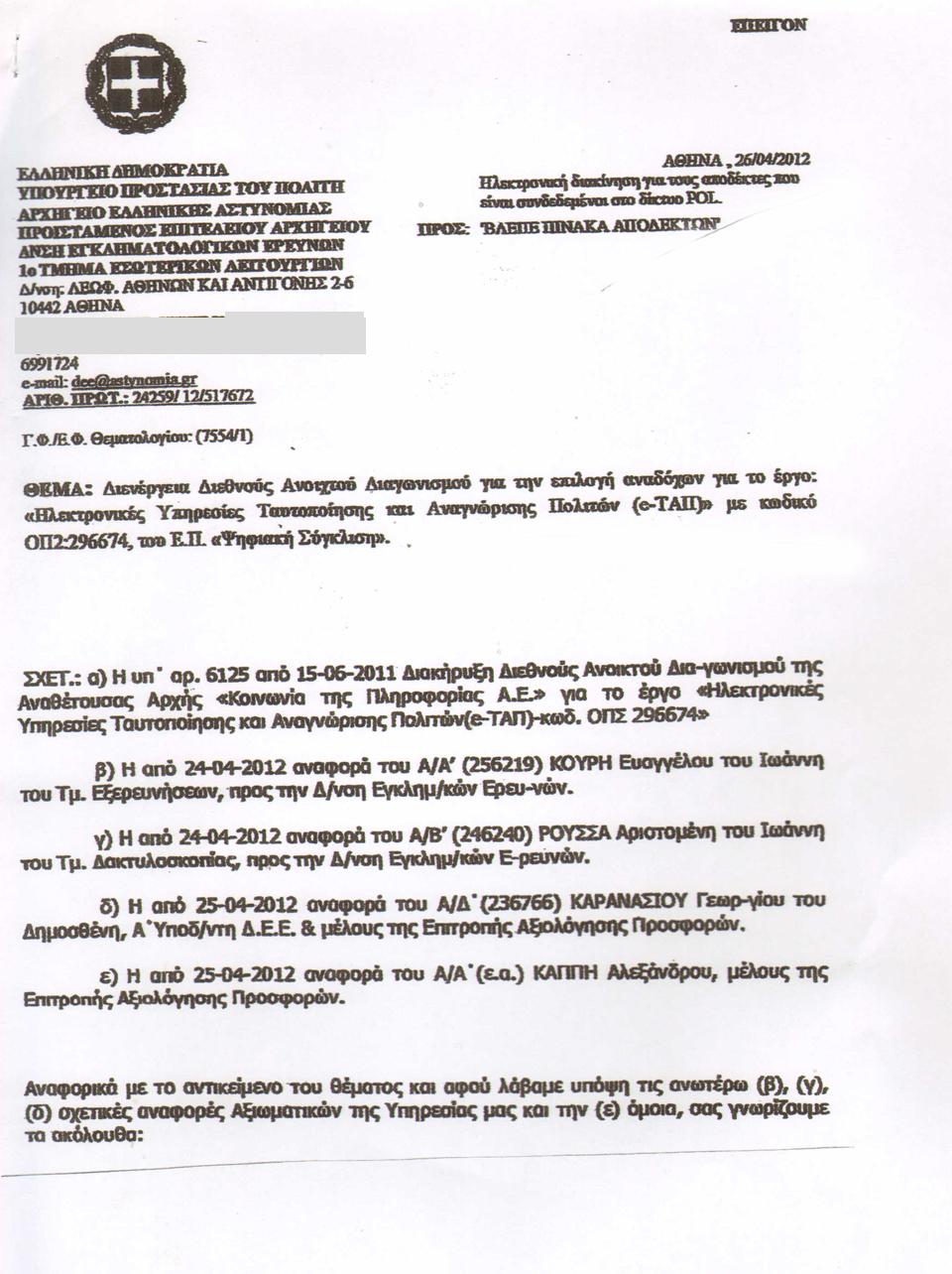 Στις 26 Απριλίου 2012 ο διευθυντής της Δ.Ε.Ε. αποστέλλει επείγουσα αναφορά στο γραφείο υφυπουργού Προστασίας του Πολίτη, κ. Ελευθέριου Οικονόμου και στην Κοινωνία της Πληροφορίας. Η ίδια αναφορά –με τις επισυναπτόμενες καταγγελίες των εμπειρογνωμόνων και των μελών της επιτροπής- κοινοποιούνται στον αρχηγό της ΕΛ.ΑΣ. και στη Διεύθυνση Πληροφορικής.
