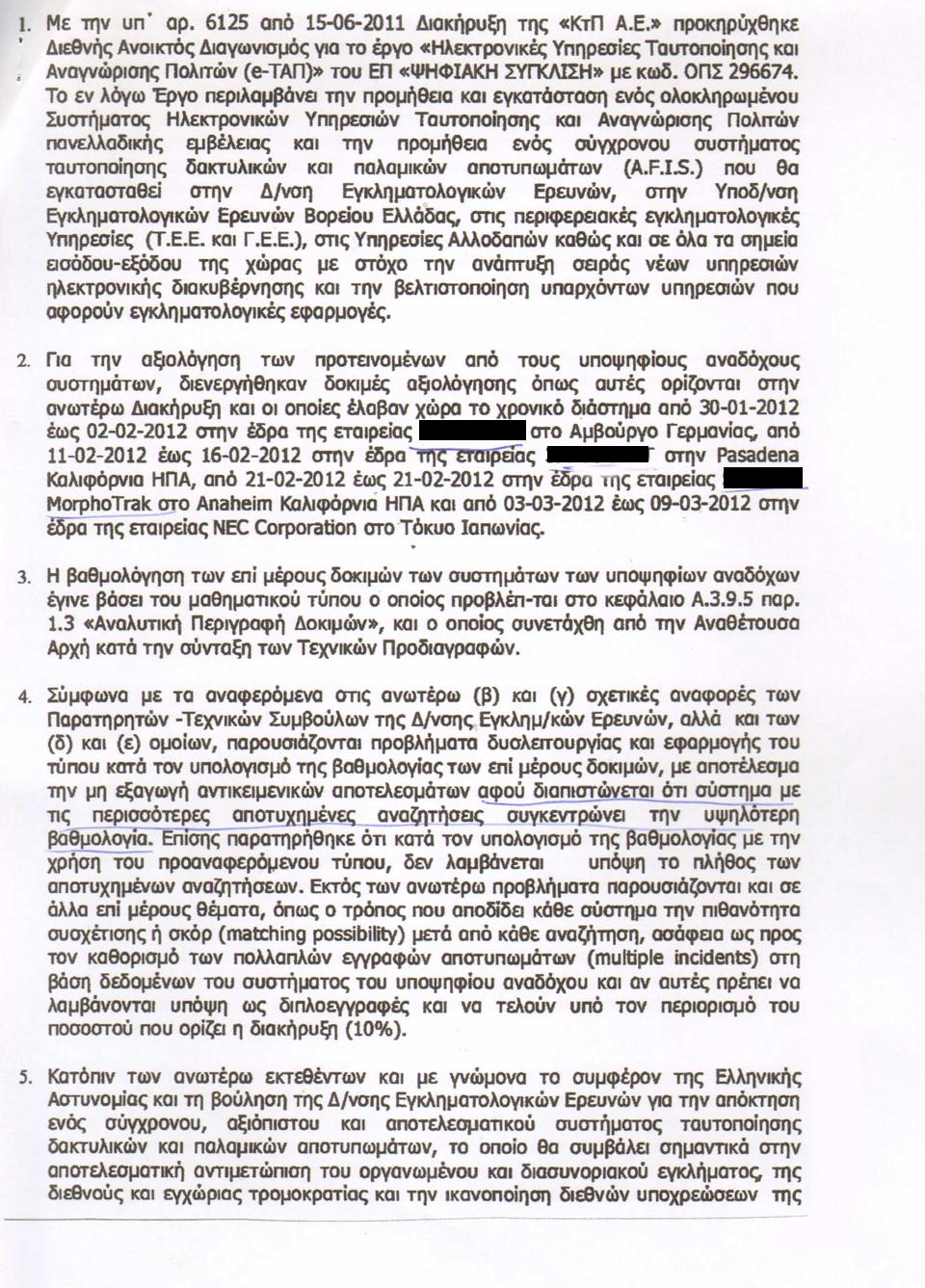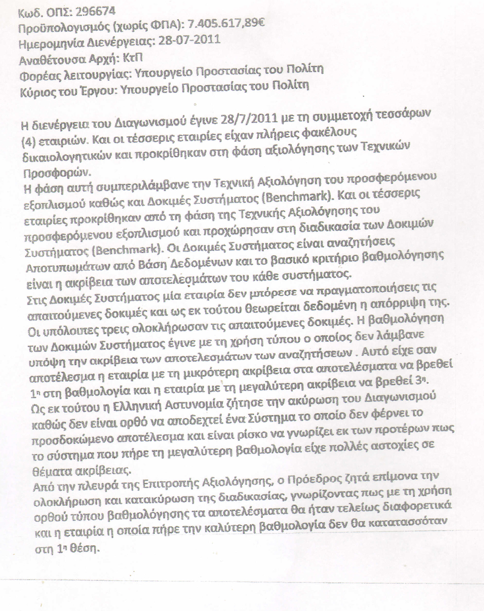 «Η βαθμολόγηση των δοκιμών συστήματος έγινε με τη χρήση τύπου ο οποίος δεν λάμβανε υπόψη την ακρίβεια των αποτελεσμάτων των αναζητήσεων και αυτό είχε ως αποτέλεσμα η εταιρία με την μικρότερη ακρίβεια να βρεθεί 1η στη βαθμολογία και η εταιρία με τη μικρότερη ακρίβεια 3η», επισημαίνει αξιωματικός της ΕΛ.ΑΣ. που ασχολήθηκε με την υπόθεση.