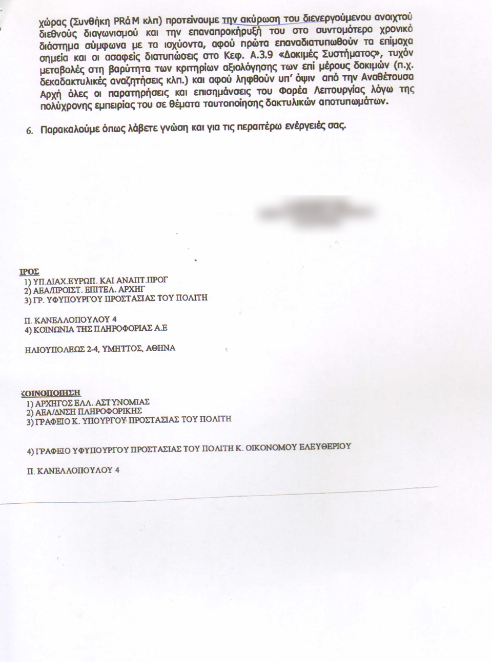 Στις 9 Ιουνίου 2012 μια ακόμη καταγγελία έρχεται να ταράξει τα «λιμνάζοντα ύδατα» του διαγωνισμού. Ανώνυμος επιστολογράφος ενημερώνει το υπουργείο Προστασίας του Πολίτη για τις παρατυπίες του διαγωνισμού, αναφέροντας ότι η Ελληνική Αστυνομία ζήτησε την ακύρωσή του «καθώς δεν είναι ορθό να αποδεχτεί ένα σύστημα το οποίο δεν φέρνει το προσδοκώμενο αποτέλεσμα και είναι ρίσκο να γνωρίζει εκ των προτέρων πως το σύστημα που πήρε τη μεγαλύτερη βαθμολογία είχε πολλές αστοχίες σε θέματα ακρίβειας».