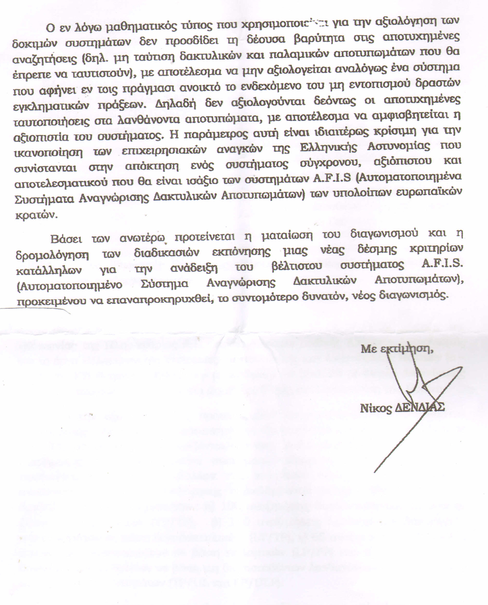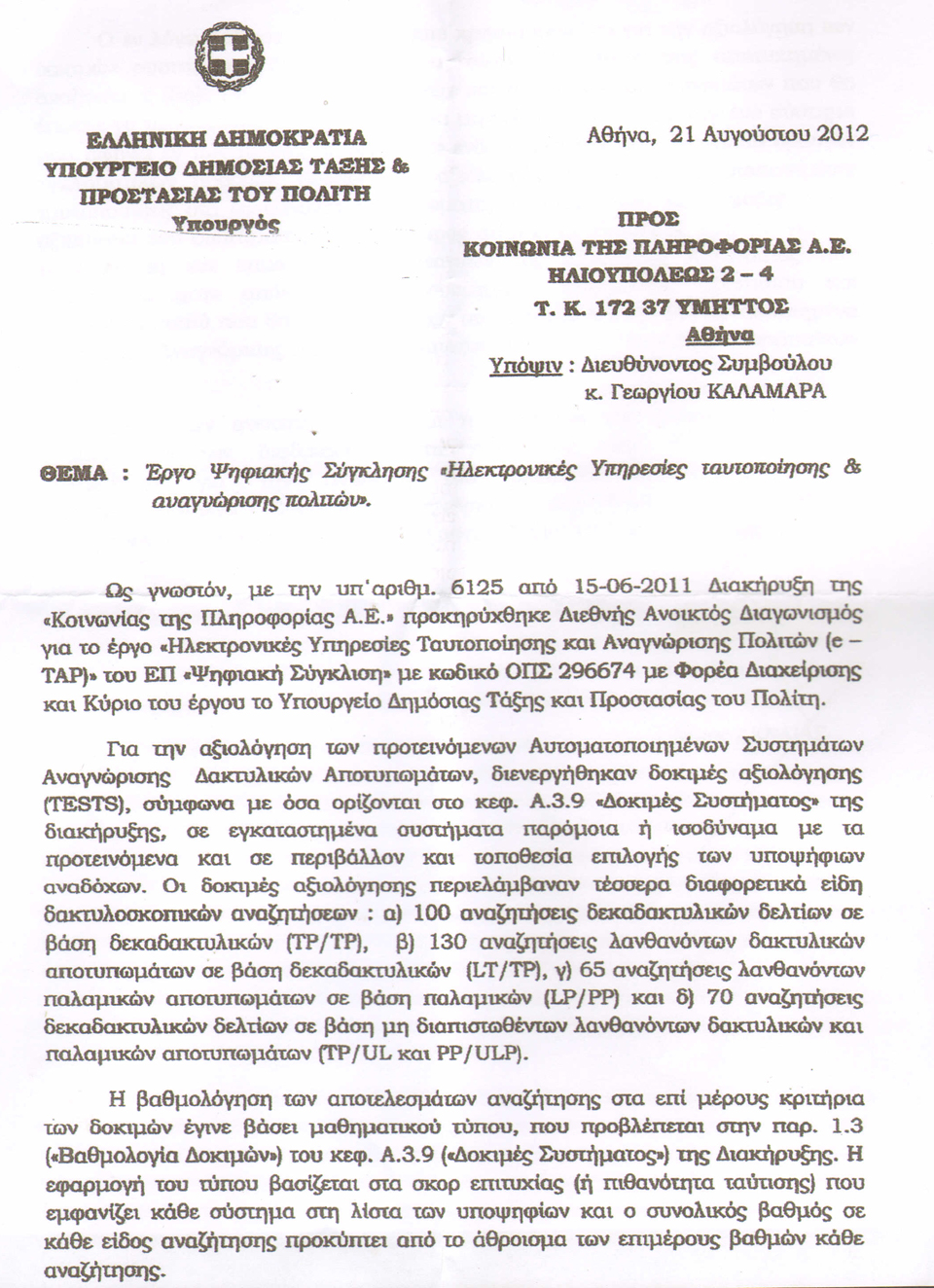 Σε ό, τι αφορά το δακτυλοσκοπικό σύστημα της ΕΛ.ΑΣ. με επιστολή του (στις 21 Αυγούστου 2012) προς τον διευθύνοντα σύμβουλο της ΚτΠ, ο υπουργός Προστασίας του Πολίτη, κ. Νίκος Δένδιας, προτείνει τη ματαίωση του διαγωνισμού με μία επιστολή κόλαφο που απέστειλε στον διευθύνοντα σύμβουλο της ΚτΠ, κ. Καλαμαρά.
