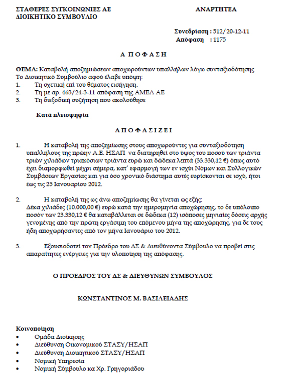 Ένα βήμα πριν από τον εισαγγελέα βρίσκεται η διοίκηση της ΣΤΑΣΥ Α.Ε. (Μετρό, Τραμ, Προαστιακός, ΗΣΑΠ), καθώς με απόφαση του διοικητικού συμβουλίου, λίγες ημέρες πριν από τα Χριστούγεννα, ενέκρινε να συνεχίσουν να δίνονται υπερδιπλάσια εφάπαξ αποζημιώσεις (ύψους 33.330 ευρώ αντί 15.000 που είναι το ανώτατο όριο) στους εκατοντάδες υπαλλήλους του Ηλεκτρικού Σιδηρόδρομου της Αθήνας, που πρόκειται να βγουν σύντομα στη σύνταξη.