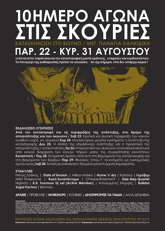 Εκδηλώσεις στις Σκουριές κατά των μεταλλείων χρυσού διοργανώνουν οι επιτροπές αγώνα Χαλκιδικής και Θεσσαλονίκης από τις 22 έως τις 31 Αυγούστου.