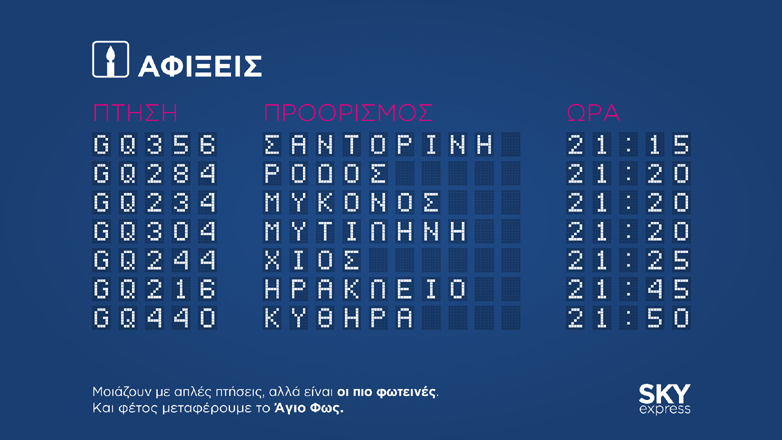 Έχοντας θέσει και φέτος τους ανθρώπους, αλλά και τα ολοκαίνουργια αεροσκάφη της στη διάθεση της ελληνικής πολιτείας, η SKY express θα μεταφέρει το Άγιο Φως της ελπίδας και της αγάπης σε κάθε γωνιά της Ελλάδας και πιο συγκεκριμένα στο Ηράκλειο, τη Ρόδο, τη Μύκονο, τη Μυτιλήνη, τη Σαντορίνη, τη Χίο και τα Κύθηρα.