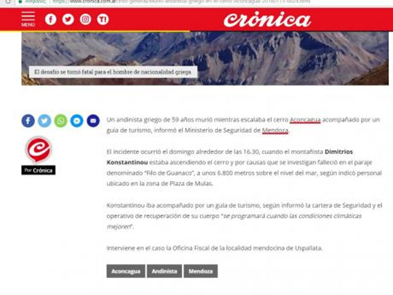 Η είδηση του θανάτου του Πατρινού έχει προκαλέσει το ενδιαφέρον και των ΜΜΕ της Αργεντινής τα οποία μεταδίδουν πληροφορίες για τον τρόπο που έχασε την ζωή του στις Άνδεις.