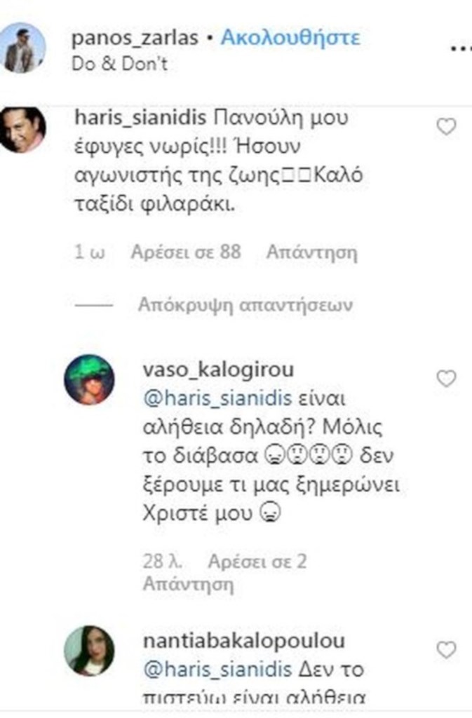 Συγκλονισμένος είναι και ο Χάρης Σιανίδης μετά τη δυσάρεστη είδηση του θανάτου του 28χρονου. Ο ίδιος άφησε ένα συγκινητικό σχόλιο κάτω από μία φωτογραφία του στο Instagram γράφοντας: «Πανούλη μου έφυγες νωρίς!!! Ήσουν αγωνιστής της ζωής. Καλό ταξίδι φιλαράκι».