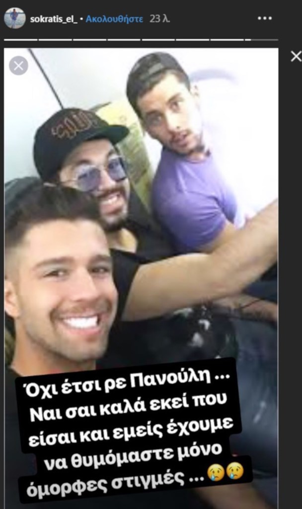 O Σωκράτης Ελ Γκαμαλί θέλησε κι εκείνος να εκφράσει τη θλίψη του για αυτό το δυσάρεστο γεγονός. Σε ανάρτησή του στο Instagram έγραψε: «Όχι έτσι ρε Πανούλη… Να σαι καλά εκεί που είσαι και εμείς έχουμε να θυμόμαστε μόνο όμορφες στιγμές…».