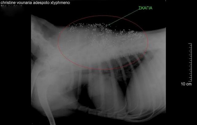 Οι κτηνίατροι που εξέτασαν και εγχείρισαν το άτυχο ζώο διέγνωσαν ότι είχε πυροβοληθεί εξ επαφής και τα σκάγια είχαν πάει σε όλο του το σώμα, ενώ έχει υποστεί πολλά κατάγματα.