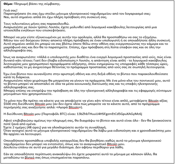 Σημειώνεται ότι τα εκβιαστικά αυτά μηνύματα ηλεκτρονικού ταχυδρομείου έχουν κυρίως τις παρακάτω μορφές και περιεχόμενο, ενώ η αναφορά σε πραγματικούς κωδικούς γίνεται ώστε οι χρήστες να πεισθούν για το αληθινό της απειλής.