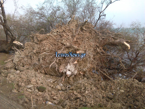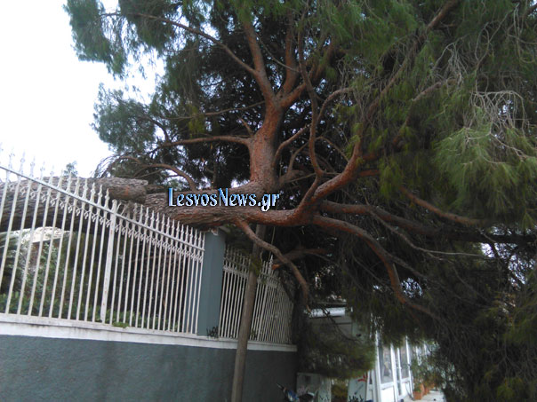 Στη διαδρομή από τη Μυτιλήνη προς το αεροδρόμιο έχουν πέσει πολλά δέντρα, ενώ σε αρκετά σημεία της πόλης έγιναν διακοπές ρεύματος.