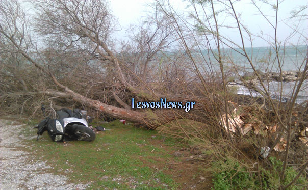 Ένας δικυκλιστής παρασύρθηκε από τον αέρα και έπεσε με το σκούτερ του πάνω σε ξεριζωμένο δένδρο στην παραλία – το οποίο αν δεν υπήρχε ίσως ο ίδιος να κατέληγε στη θάλασσα.