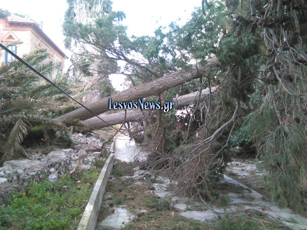 Στη διαδρομή από τη Μυτιλήνη προς το αεροδρόμιο έχουν πέσει πολλά δέντρα, ενώ σε αρκετά σημεία της πόλης έγιναν διακοπές ρεύματος.
