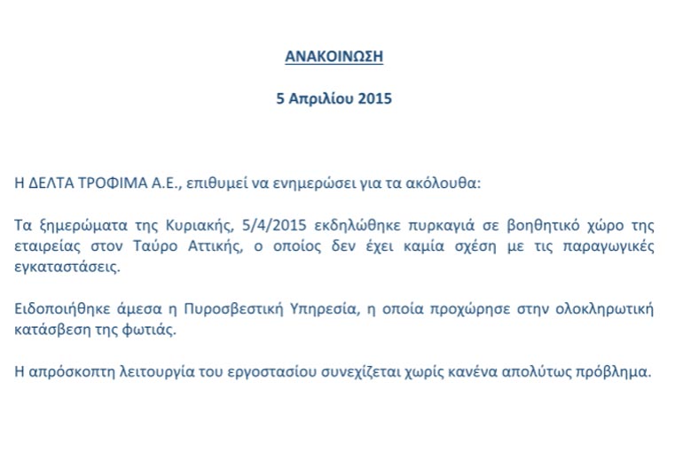 Zημιές προκλήθηκαν από πυρκαγιά που ξέσπασε, από άγνωστη μέχρι στιγμής αιτία, τα ξημερώματα, στον προαύλιο χώρο του εργοστασίου της γαλακτοβιομηχανίας ΔΕΛΤΑ, στην λεωφόρο Ειρήνης 16 στον Ταύρο.