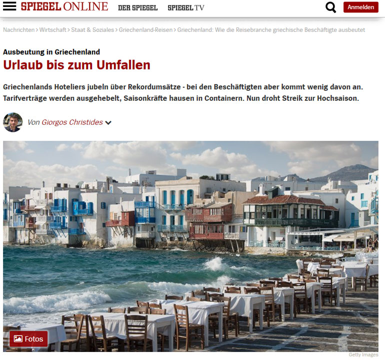 «Ο ελληνικός τουριστικός κλάδος ανθεί. Φέτος αναμένονται 30 εκατομμύρια τουρίστες, περισσότερους από ποτέ στο παρελθόν. Αν το δει κανείς στατιστικά, αυτό σημαίνει ότι το 2017 σε κάθε Έλληνα αντιστοιχούν τρεις τουρίστες», σημειώνει το Spiegel αναπαράγοντας πρόσφατες θριαμβευτικές δηλώσεις του πρωθυπουργού Αλέξη Τσίπρα ενώπιον ξενοδόχων. «Ο ενθουσιασμός του είναι κατανοητός. Ο τουρισμός προβλέπεται ότι θα φέρει στην Ελλάδα φέτος έσοδα 14 δις ευρώ από το εξωτερικό – ένα σημαντικό στήριγμα για την επιβίωση της κλονισμένης από την κρίση εγχώριας οικονομίας. Ωστόσο, το τίμημα πληρώνουν πολλοί από 340.000 και πλέον απασχολούμενους του κλάδου. Οι ώρες στη δουλειά είναι πολλές, οι αμοιβές μικρές. Πολλοί Έλληνες απασχολούνται παράνομα, δεν έχουν ασφαλιστική προστασία και μπορούν εύκολα να απολυθούν. ‘Τα ρεκόρ και τα κέρδη βασίζονται σε εργαζόμενους που δουλεύουν υπερβολικά και υφίστανται εκμετάλλευση, ενώ πολλοί από αυτούς καταρρέουν από εξάντληση’, λέει ο Κυριάκος Τσιαούσης, πρόεδρος του Συνδικάτου Εργαζομένων Τουριστικών – Επισιτιστικών Επιχειρήσεων Θεσσαλονίκης, Πιερίας και Χαλκιδικής».