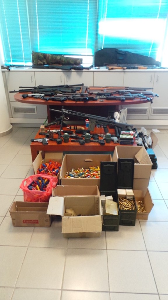 Ειδικότερα, κατά τη διάρκεια των ερευνών, βρέθηκαν και κατασχέθηκαν: Πέντε πολεμικά όπλα εκ των οποίων τα τρία τύπου καλάσνικοφ, 12 κυνηγετικές καραμπίνες (μονόκαννες), κυνηγετικό μονόκαννο όπλο και εμπροσθογεμές μονόκαννο όπλο, τέσσερα αεροβόλα τυφέκια, ένα οπλοπολυβόλο, δέκα υποπολυβόλα, πέντε πιστόλια αεροβόλα, τρία πιστόλια, δύο πιστόλια κρότου, δύο πιστόλια τύπου «στυλό», τέσσερα περίστροφα, πολεμικό τυφέκιο (replica), μεταλλική βαλλίστρα, τρεις χειροβομβίδες αμυντικού τύπου, 52 γεμιστήρες διαφόρων τύπων, 1.350 κυνηγετικά φυσίγγια και 1.118 φυσίγγια πολεμικού όπλου διαφόρων τύπων και διαμετρημάτων, 300 φυσίγγια πολεμικού τυφεκίου, τύπου Kalashnikov, 502 φυσίγγια πιστολιού, διαφόρων τύπων και διαμετρημάτων, καψύλλια πιστολιού, πλήθος εξαρτήματα, παρελκόμενα όπλων και τυφεκίων, δύο σιγαστήρες υποπολυβόλου, τέσσερις συσκευασίες με βολίδες, διαφόρων διαμετρημάτων, δύο συσκευασίες περιέχουσες μεταλλικά σφαιρίδια κυνηγετικού όπλου, τέσσερα κυτία με άκαπνη πυρίτιδα, δύο μαχαίρια και δύο συσκευασίες περιέχουσες κενά φυσίγγια (κάλυκες) πιστολιού, πολεμικών τυφεκίων, κυνηγετικών όπλων και κενά φυσίγγια κυνηγετικών όπλων.