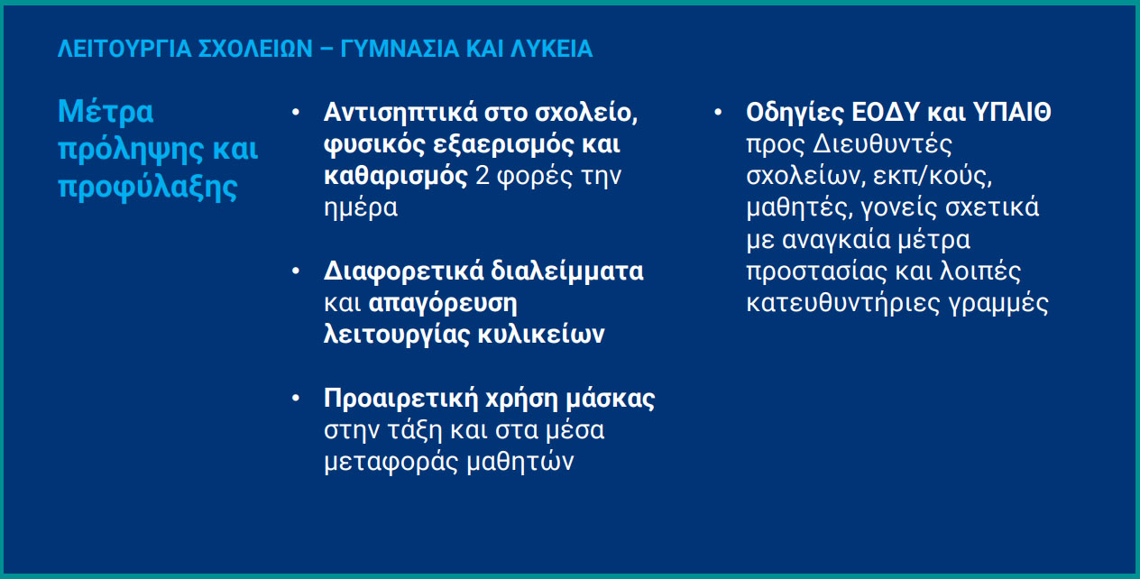 Στα σχολεία θα γίνεται φυσικός εξαερισμός, θα υπάρχουν αντισηπτικά και θα πραγματοποιείται καθαρισμός δύο φορές την ημέρα. Οι μαθητές θα έχουν διαφορετικά διαλείμματα ενώ τα κυλικεία δεν θα λειτουργούν. η χρήση μάσκας στον χώρο του σχολείου και στα μέσα μεταφοράς των μαθητών, όπως για παράδειγμα τα σχολικά λεωφορεία, θα είναι προαιρετική.