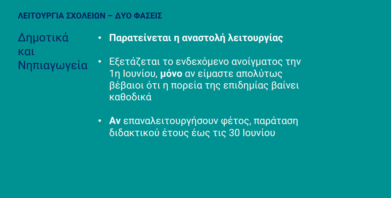 Σχετικά με τα Δημοτικά και τα Νηπιαγωγεία, η κ. Κεραμέως δήλωσε πως παρατείνεται η αναστολή της λειτουργίας τους, ενώ εξετάζεται το ενδεχόμενο ανοίγματος την 1η Ιουνίου, αν υπάρχει βεβαιότητα για την καθοδική πορεία της επιδημίας.