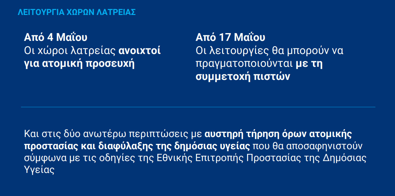 - Από 4 Μαΐου, οι χώροι λατρείας θα είναι ανοιχτοί για ατομική προσευχή.