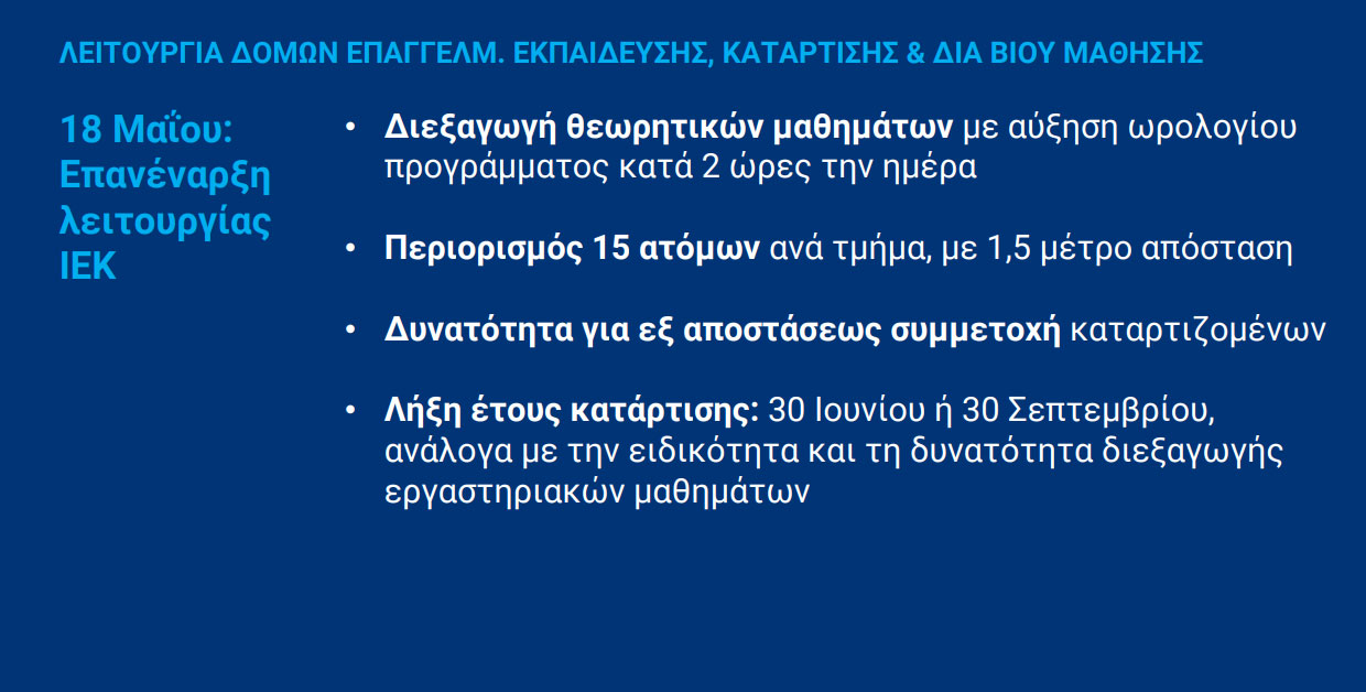 Η επανέναρξη της λειτουργίας των ΙΕΚ αναμένεται στις 18 Μαΐου. Και σε αυτήν την περίπτωση θα ισχύει ο περιορισμός των 15 ατόμων σε κάθε τμήμα, αλλά και της απόστασης 1.5 μέτρου.