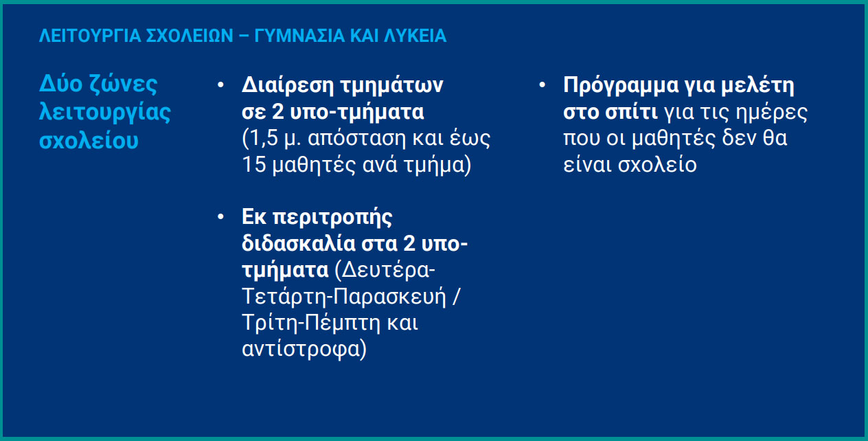 Οι μαθητές θα πηγαίνουν στο σχολεία σε εκ περιτροπής υπο-τμήματα που θα προκύψουν από τη διαίρεση του τμήματος στα δύο με στόχο τη μείωση του συγχρωτισμού στις αίθουσες. Η απόσταση μεταξύ μαθητών θα πρέπει να είναι 1,5 μέτρο και ο μέγιστος αριθμός μαθητών σε κάθε τάξη τα 15 άτομα.
