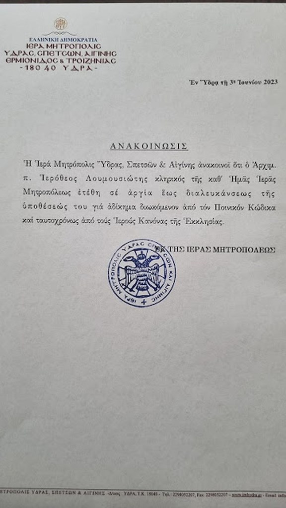 «Η `Ιερά Μητρόπολις “Υδρας, Σπετσών & Αιγίνης άνακοινοί ότι ό Άρχιμ. π. `Ιερόθεος Λουμουσιώτης κληρικός τής καθ’ `Ημάς `Ιεράς Μητροπόλεως έτέθη σέ αργία ως διαλευκάνσεως τής ύποθέσεώς του γιά αδίκημα διωκόμενον άπό τόν Ποινικόν Κώδικα καί ταυτοχρόνως άπό τούς `Ιερούς Κανόνας τής `Εκκλησίας.»