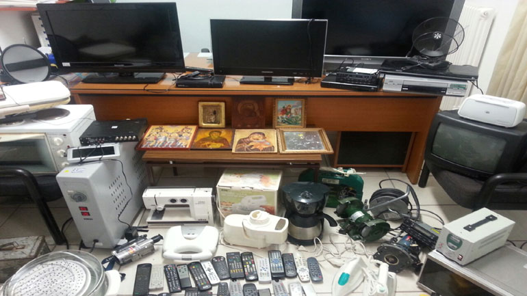 Σε νομότυπες έρευνες που πραγματοποιήθηκαν στα σπίτια τους βρέθηκαν και κατασχέθηκαν πληθώρα ηλεκτρικών και ηλεκτρονικών συσκευών καθώς και επτά αγιογραφημένες εικόνες.