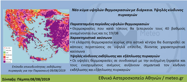 Αύριο, Παρασκευή που το μελτέμι στο Αιγαίο δεν αναμένεται να ξεπεράσει τα πέντε με έξι μποφόρ, ο κίνδυνος δασικών πυρκαγιών θα είναι υψηλός σε αρκετές περιοχές λόγω των ζεστών και ξηρών συνθηκών.