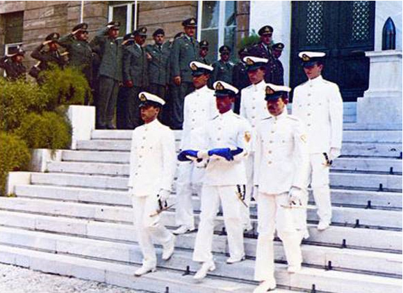 (ΦΩΤΟ: Οι απόφοιτοι του 83′. O Π. Φαραντάτος κρατά τη σημαία της σχολής ως αρχηγός)