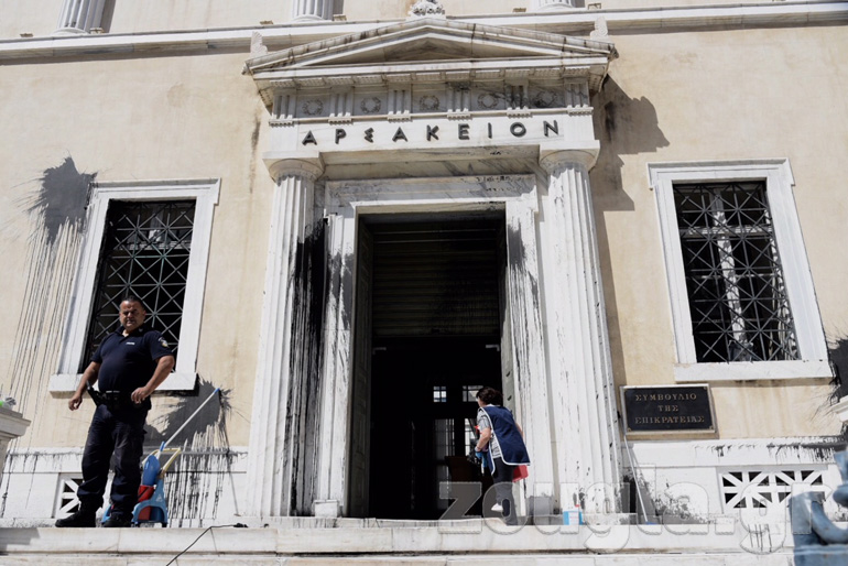 Η επόμενη ημέρα στο Συμβούλιο της Επικρατείας βρίσκει τα συνεργεία να προσπαθούν να καθαρίσουν τους τοίχους του κτηρίου από τις μπογιές που πέταξαν τα μέλη του «Ρουβίκωνα» και των άλλων συλλογικοτήτων, τα οποία πραγματοποίησαν τη χθεσινή επίθεση.