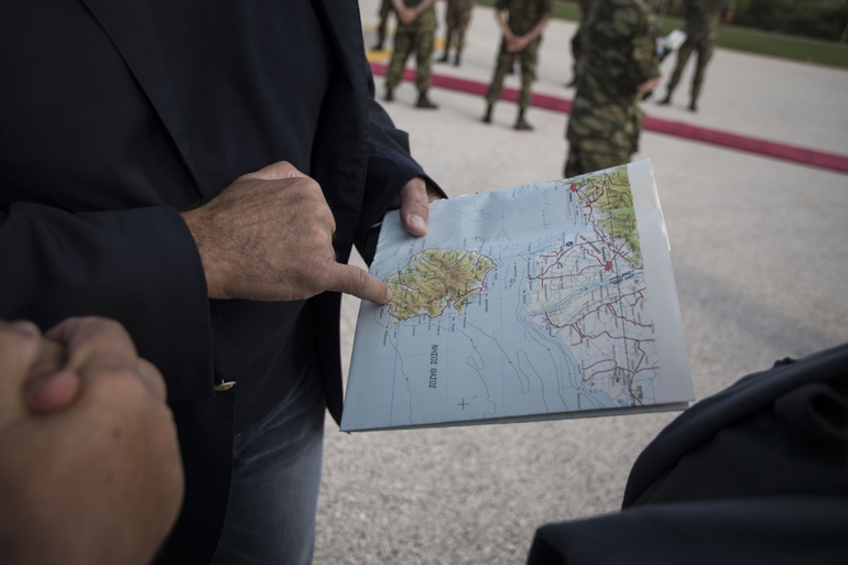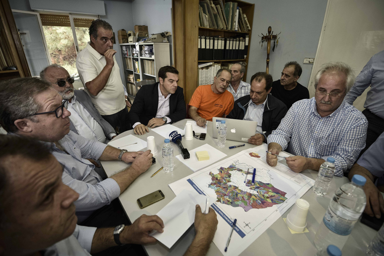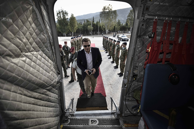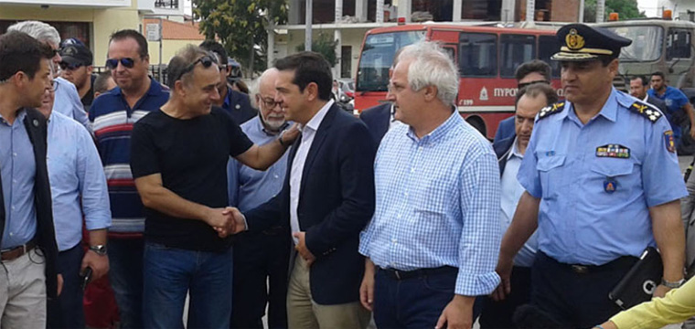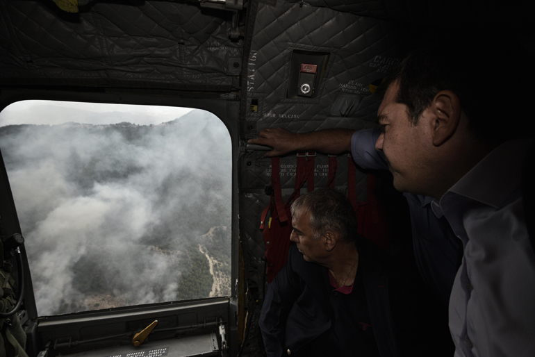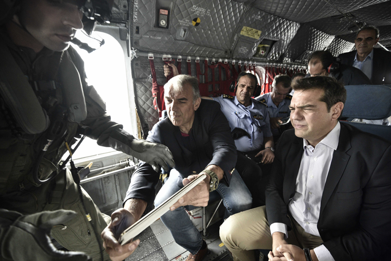 Ο πρωθυπουργός έφθασε στο νησί με ελικόπτερο Σινούκ της αεροπορίας στρατού, συνοδευόμενος από τους υπουργούς Εσωτερικών και Διοικητικής Ανασυγκρότησης Παναγιώτη Κουρουμπλή, και Υποδομών, Μεταφορών και Δικτύων Χρήστο Σπίρτζη, καθώς και από τον γενικό γραμματέα Πολιτικής Προστασίας, Γιάννη Καπάκη, και τον αρχηγό του Πυροσβεστικού Σώματος, αντιστράτηγο ΠΣ Ιωάννη Καρατζιά.