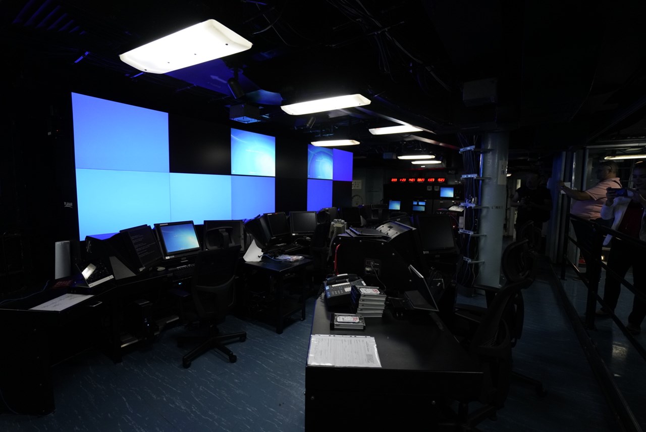 Επιστροφή όμως στα άδυτα του JOC όπου δεκάδες οθόνες υπολογιστών και ειδικά τερματικά διασυνδεδεμένα με την τελευταία λέξη της τεχνολογίας σε δύο από τις αίθουσες του σκάφους, όπου επετράπη τελικά η σύντομη παρουσία των ΜΜΕ συνθέτουν μια εικόνα άκρως εντυπωσιακά. Ένα μεγάλων διαστάσεων videowall, τηλέφωνα, συσκευές που θα διασφαλίσουν την ασφάλεια της ηλεκτρονικής και φωνητικής επικοινωνίας και συνθήκες σχεδόν ψύχους με τα παράθυρα να απουσιάζουν. Εδώ δεκάδες χειριστές επικοινωνούν με ότι κινείται πάνω και κάτω από νερό. Είναι το κύριο τμήμα του Mount Whitney που πήρε το όνομα του από την υψηλότερη κορυφή της κεντρικής οροσειράς των ΗΠΑ που είναι αδύνατο να δει κανείς πέρα στην πραγματικότητα και έδιναν την αίσθηση σκηνικού ταινίας δράσης. Χιλιόμετρα καλωδίων συνδέουν όχι μόνο τα τμήματα του Άκρως Απόρρητου όταν είναι σε λειτουργία JOC αλλά και το σύνολο του πλοίου. Ερωτηθείς από το ΑΠΕ ΜΠΕ αν έτσι μπορεί να μεταδοθεί εικόνα και δεδομένα παντού μέσα στο σκάφος ο αξιωματικός του 6ου Στόλου που έχει τοποθετηθεί αυτό το διάστημα στο σκάφος – και δεν αποτελεί, όπως τόνισε, μέλος του πληρώματος, εξηγεί πως αυτό είναι το μεγάλο όπλο του σκάφους. Κάθε σημείο μέσα στα 200 μέτρα του σκάφους που έχει οθόνη και υπολογιστικά συστήματα “μπορεί να εμφανίσει οποιαδήποτε πληροφορία και έτσι δεν χρειάζονται οι μετακινήσεις του προσωπικού”.