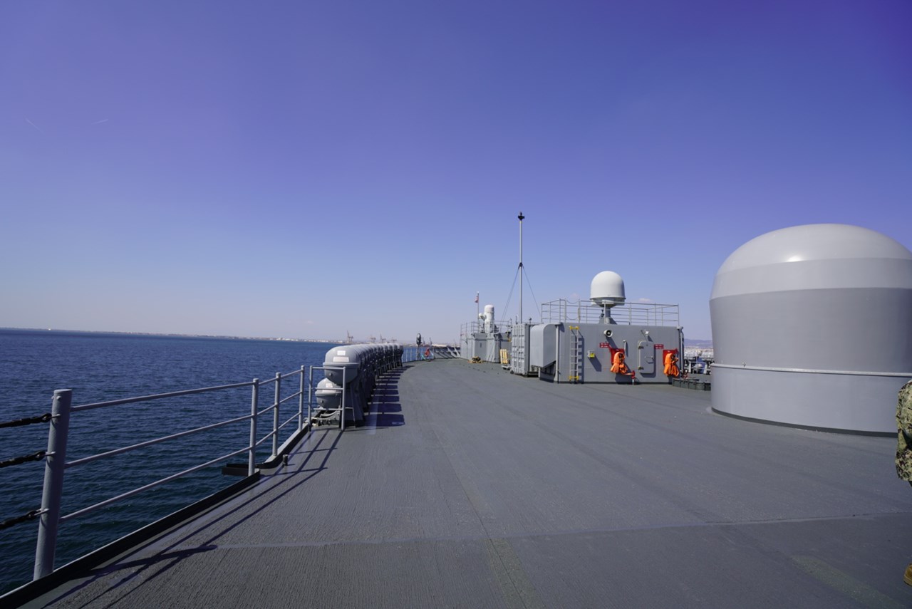 Στο κατάστρωμα, όπου έχουν αναλάβει την ξενάγηση ο υποπλοίαρχος Alban Dervishi και οι ειδικοί επιχειρήσεων Adam Villata (IT2) και Michael Visoni (ET2), ένας μεγάλος χώρος είναι άδειος από πλήρωμα και εξοπλισμό. Το μόνο που ξεχωρίζει είναι θόλοι σε ναυτικό γαλάζιο/γκρι χρώμα, γύρω από τους οποίους υπάρχουν ομόκεντροι κύκλοι βαμμένοι με κόκκινο, μέσα στους οποίους απαγορεύεται να πατήσει άνθρωπος όταν τα συστήματα είναι σε λειτουργία. Είναι τα τμήματα της σουίτας επικοινωνιών και μετάδοσης δεδομένων του Mount Whitney, που αν και παραδόθηκε στο Αμερικανικό Ναυτικό στις αρχές της δεκαετίας του ’70 δείχνει σαν να βγήκε από ένα ναυπηγείο σχετικά πρόσφατα.