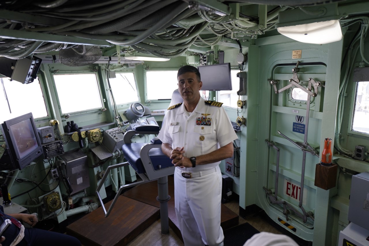 Μιας Διεθνούς Έκθεσης, που έχει τιμώμενη χώρα εκείνη που διαθέτει έναν στόλο 430 περίπου πολεμικών πλοίων, τον ισχυρότερο στον κόσμο. «Είναι μεγάλη ευχαρίστηση για εμένα και το πλήρωμά μου να βρισκόμαστε στη Θεσσαλονίκη και τη Βόρεια Ελλάδα, ειδικά αυτή την ξεχωριστή εβδομάδα που είναι σε εξέλιξη η Διεθνής Έκθεση, έχουμε την ευκαιρία να ενδυναμώσουμε τις σχέσεις μας με την Ελλάδα και με τα στελέχη των ελληνικών ενόπλων δυνάμεων. Είναι πολύ σημαντική η συνεργασία με τις ελληνικές αρχές και για τα δύο κράτη, ιδίως λόγω της γεωστρατηγικής θέσης της Ελλάδας», τόνισε λίγη ώρα πριν όταν υποδέχθηκε τους επισκέπτες ο σχετικά νέος διοικητής (Commanding Officer, CO) του πλοίου πλοίαρχος Robert Aguilar.