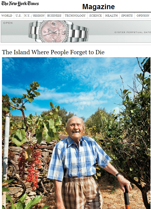 Αυτήν τη φορά εκτεταμένη παρουσίαση του ελληνικού νησιού φιλοξενείται στο ένθετο περιοδικό της εφημερίδας «The New York Times». Ενδεικτικός είναι ο τίτλος: «The Island Where People Forget to Die» (Το νησί όπου οι άνθρωποι ξεχνούν να πεθάνουν).