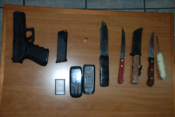 Στην φωτογραφία φαίνεται καθαρά το όπλο GLOCK που χρησιμοποίησε ο βαρυποινίτης Παναγιώτης Βλαστός στην προσπάθειά του να αποδράσει, αλλά και τα αυτοσχέδια σουβλιά και μαχαίρια των μελών της «Συνομωσίας Πυρήνων της Φωτιάς Χρ. Τσάκαλος, Γ. Νικολόπουλος, Μιχ. Νικολόπουλος, Γ. Πολύδωρος και Θεοφ. Μαυρόπουλος.