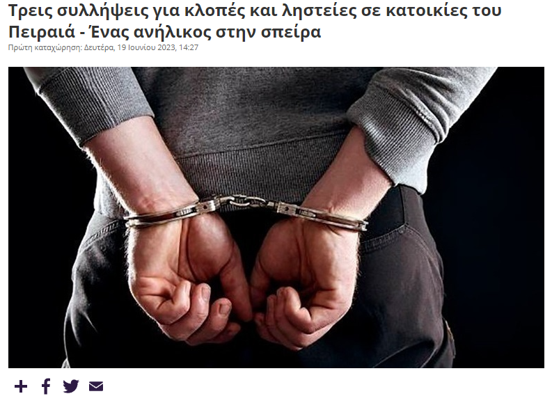 Δίνονται στη δημοσιότητα, κατόπιν σχετικής Διάταξης της Εισαγγελίας Πρωτοδικών Πειραιά, τα στοιχεία ταυτότητας και οι φωτογραφίες δύο ανδρών, που είχαν ενωθεί με σκοπό τη διάπραξη ληστειών και κλοπών από οικίες με τη μέθοδο της απασχόλησης, οι οποίοι συνελήφθησαν την 16-6-2023 από το Τμήμα Δίωξης Εγκλημάτων κατά Ιδιοκτησίας της Διεύθυνσης Ασφάλειας Αττικής (σχετικό το από 19-6-2023 Δελτίο Τύπου).