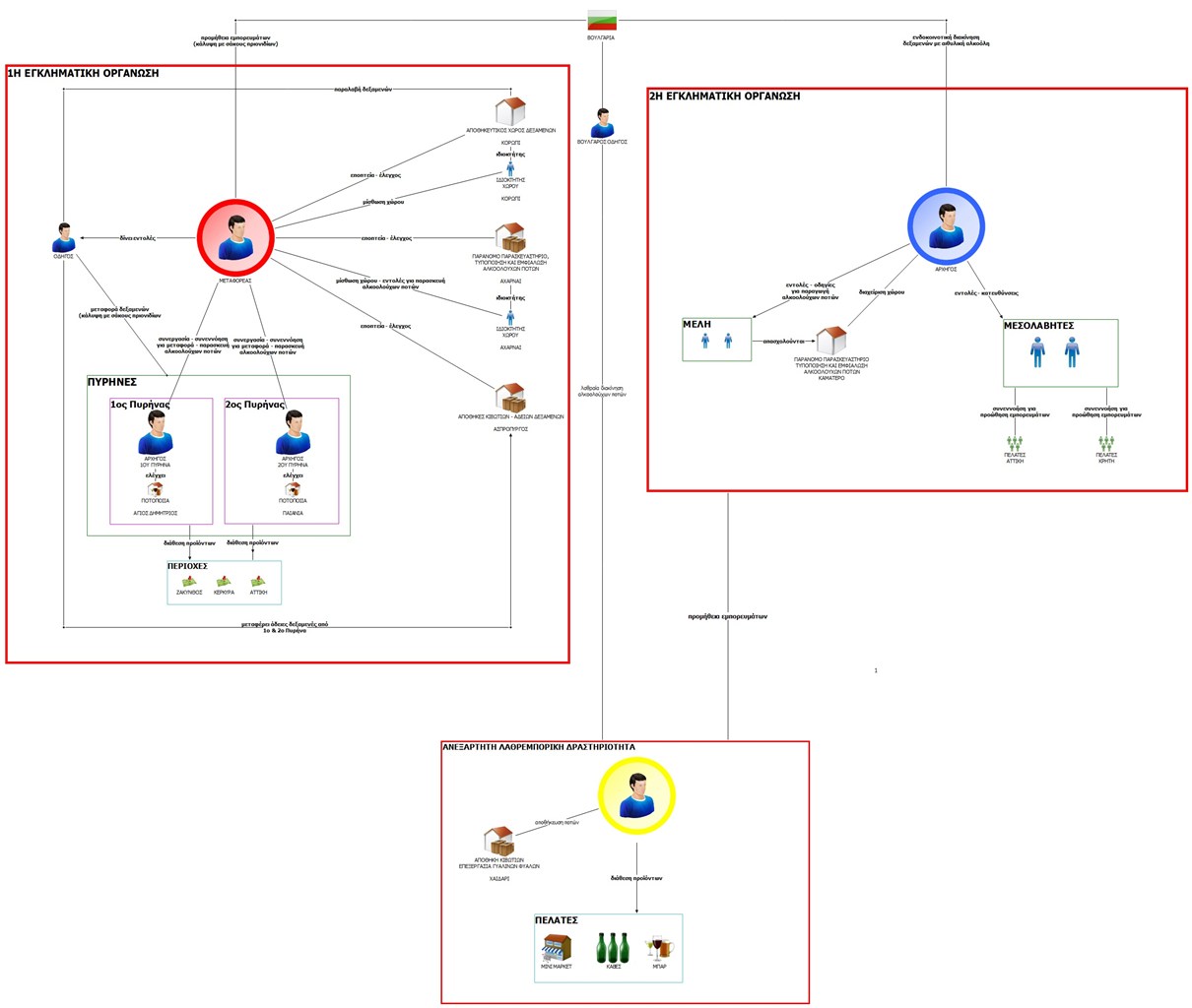 Αρχηγικό ρόλο για τον πρώτο και δεύτερο πυρήνα, αντίστοιχα, είχε 47χρονος Έλληνας, ιδιοκτήτης αδειοδοτημένης ποτοποιίας σε περιοχή της Αττικής και 63χρονη Ελληνίδα, «αφανής» διαχειρίστρια αδειοδοτημένης ποτοποιίας, οι οποίοι χρηματοδοτούσαν την παράνομη εισαγωγή αλκοόλης από το εξωτερικό και εκμεταλλευόμενοι την υποδομή και τον εξοπλισμό των νόμιμων επιχειρήσεων τους, προέβαιναν στην παρασκευή αλκοολούχων ποτών.
