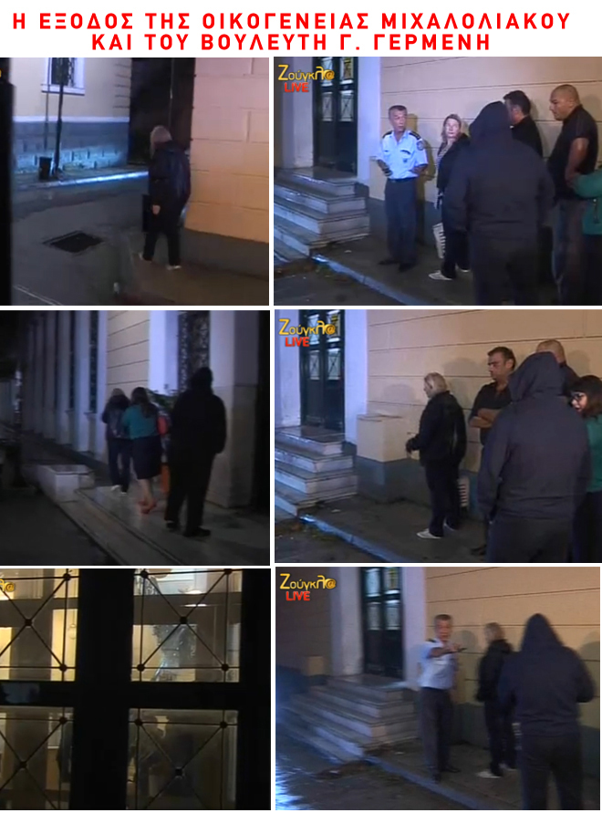 Ο Νίκος Μιχαλολιάκος εξήλθε από την πόρτα του κτηρίου 6 των δικαστηρίων στις 04.38 π.μ. φωνάζοντας «ζήτω η νίκη» και οδηγήθηκε στα κρατητήρια της ΓΑΔΑ. Έξω από τα δικαστήρια ανέμεναν η σύζυγός του, Ελένη Ζαρούλια, η κόρη του Ουρανία, ο βουλευτής Γιώργος Γερμενής και άλλα μέλη της Χρυσής Αυγής, που κατά την έξοδο του γ.γ. του κόμματος φώναξαν συνθήματα όπως: «Αίμα, τιμή, Χρυσή Αυγή».