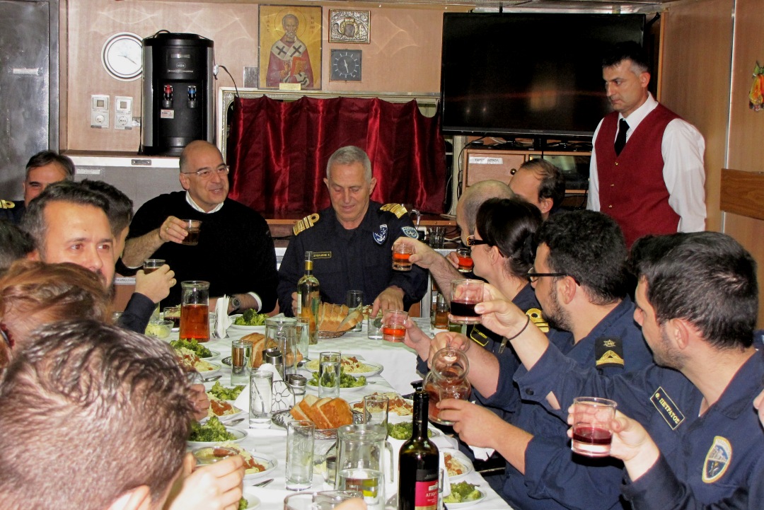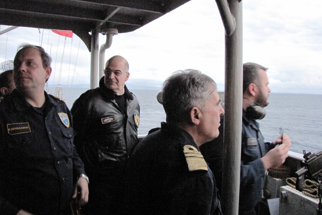 Λίγο πριν επιβιβαστεί σε ελικόπτερο τύπου «Aegean Hawk» ο κ. Δένδιας απηύθυνε από το ελικοδρόμιο της φρεγάτας τον ακόλουθο χαιρετισμό προς το πλήρωμα: