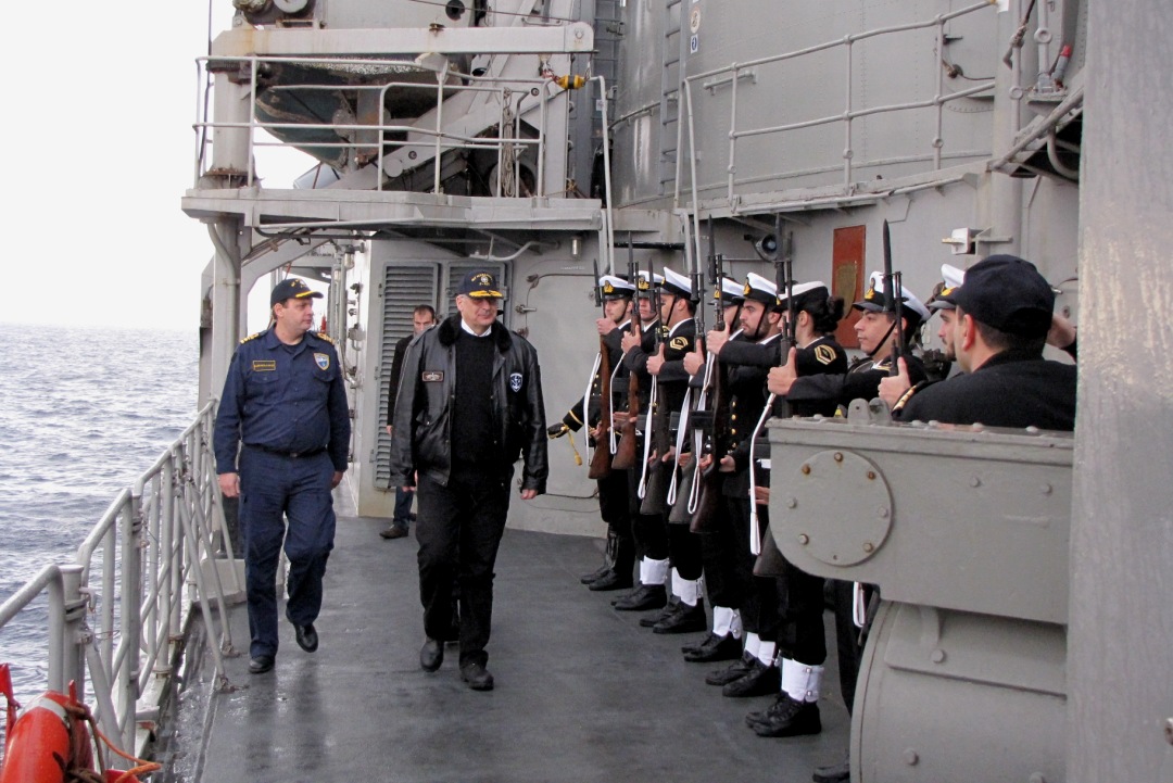 Χθες το βράδυ ο κ. Δένδιας ξεναγήθηκε στη φρεγάτα, που πλέει σε διατεταγμένη υπηρεσία στο Αιγαίο, ενημερώθηκε για την αποστολή του πλοίου και του πληρώματος, ενώ είχε την ευκαιρία να παρακολουθήσει άσκηση επιχειρησιακής ετοιμότητας εν πλω βάσει ρεαλιστικού σεναρίου.