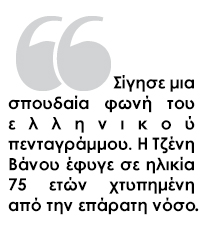 Μια μεγάλη φωνή θρηνεί το ελληνικό πεντάγραμμο. Η Τζένη Βάνου, η οποία αντιμετώπιζε προβλήματα υγείας και πρόσφατα είχε υποβληθεί σε επέμβαση για αφαίρεση όγκου, απεβίωσε σήμερα στις 11.00 το πρωί, σε ηλικία 75 ετών, στο Νοσοκομείο «Μεταξά».
