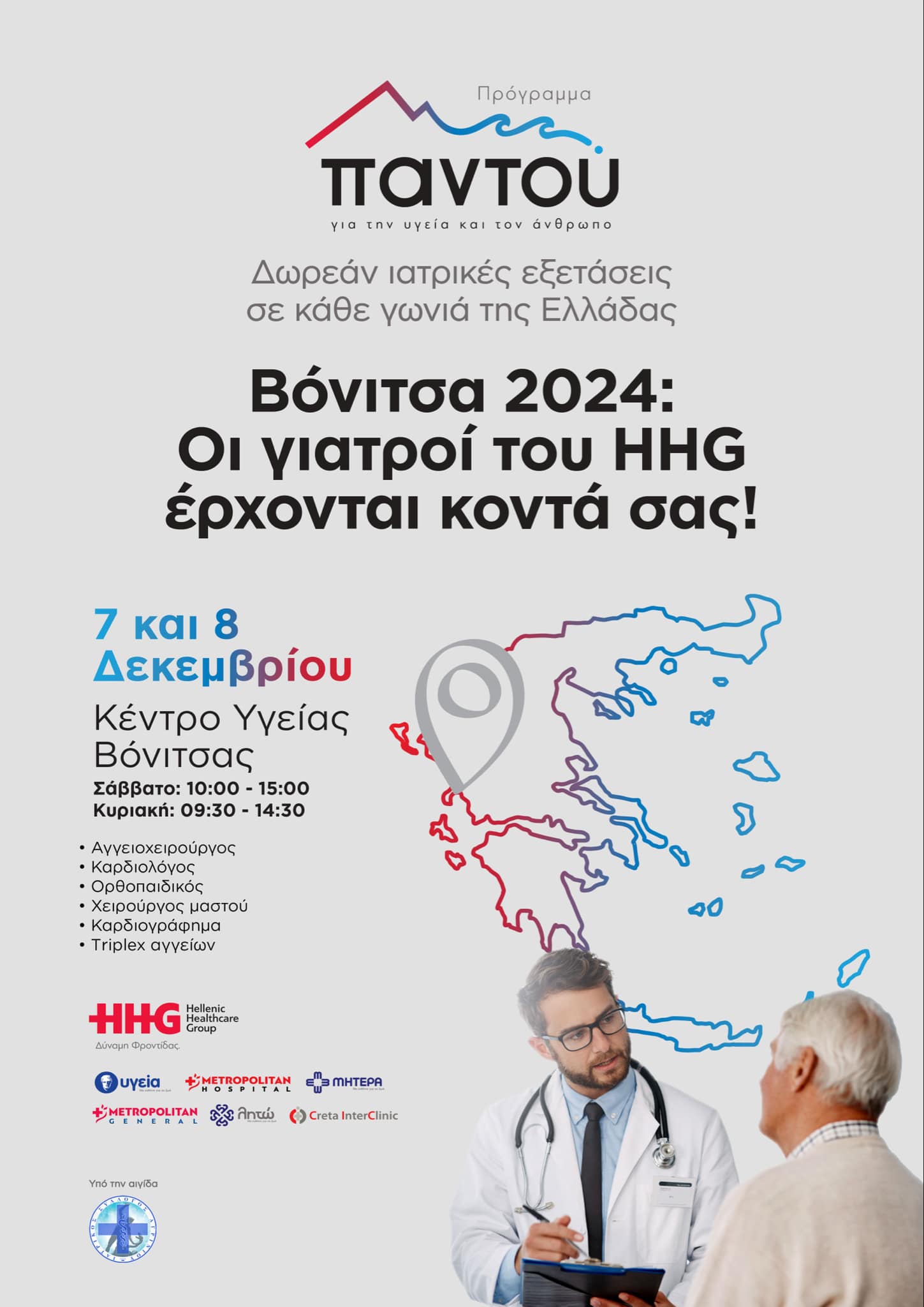 Κλιμάκιο ιατρών του Ομίλου Ηellenic Healthcare (HHG) βρίσκονται στο Κέντρο Υγείας Βόνιτσας σήμερα Σάββατο 7 Δεκεμβρίου και αύριο Κυριακή 8 Δεκεμβρίου για δωρεάν εξετάσεις στους κατοίκους της περιοχής.