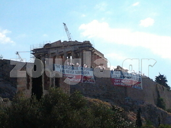 | Τα δύο πανό που κρέμασαν στον ιερό βράχο της Ακρόπολης |