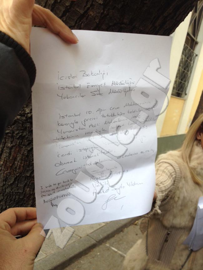 Η δήλωση του Άγγελου Φιλιππίδη στα τουρκικά. Στο τέλος του κειμένου αναφέρεται στην αγγλική γλώσσα: «Επιθυμώ την επιστροφή μου άμεσα στην Ελλάδα, όπως δήλωσα στο δικαστήριο».